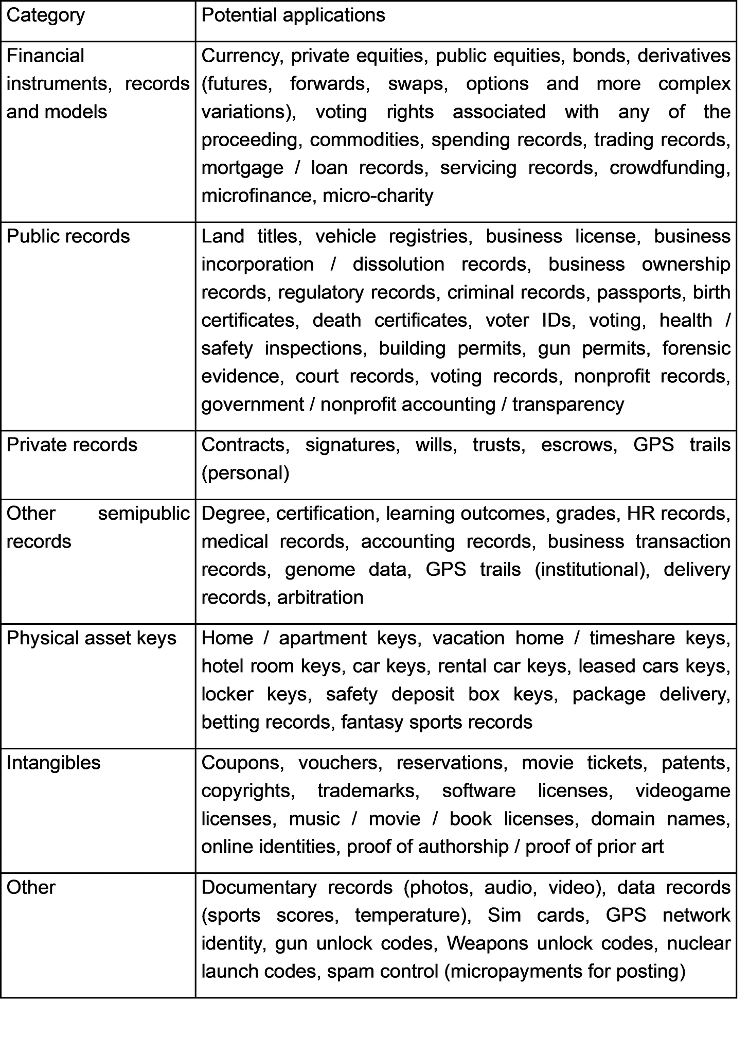 Let us now consider how the field has developed over time. A few years ago, most were thinking “How can we put things on the blockchain?”. Swan collected business ideas around 2015 and they were all focused on existing ideas. The ideas were around certificates, financial markets or land titles as shown in the table below.